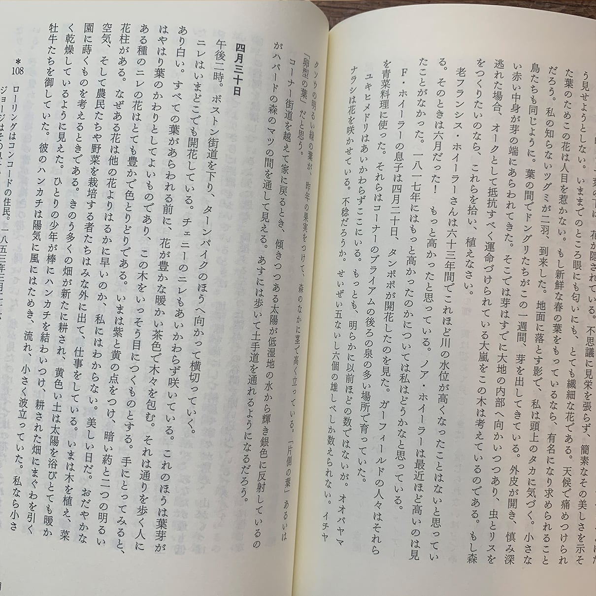 日本に住む多くの人にとってソローと言えば『森の生活』です。孤独・孤高の人というイメージも強いでしょう。私もそうでした。でも山口さんは「彼にとって森の生活は、そうでなかった日々とくらべ根本的に大切だったのだろうか」と問いかけます。日記は「そうでなかった日々」が静かに深く流れていきます。山口さんは言います。そんなソローの何気ない日々は私たちのふつうの日々に繋がっていると。